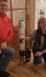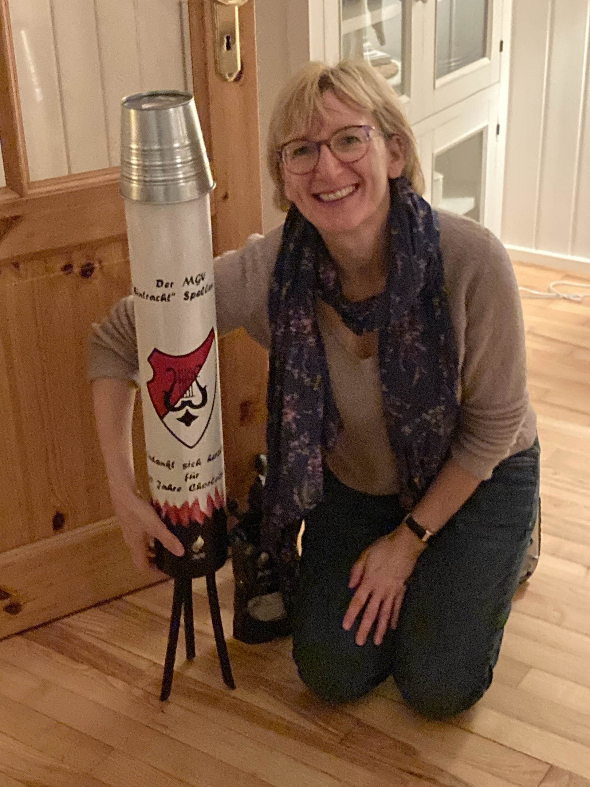 Anlässlich ihres 10- jährigen Jubiläums als Chorleiterin des MGV „Eintracht“ Spellen überreichten die beiden Vorsitzenden Michaela ein Jubiläumspräsent. Eine Outdoor-Fackel mit MGV-Wappen erinnert sie auch in der probenfreien Zeit an die Sänger der „Eintracht“.
